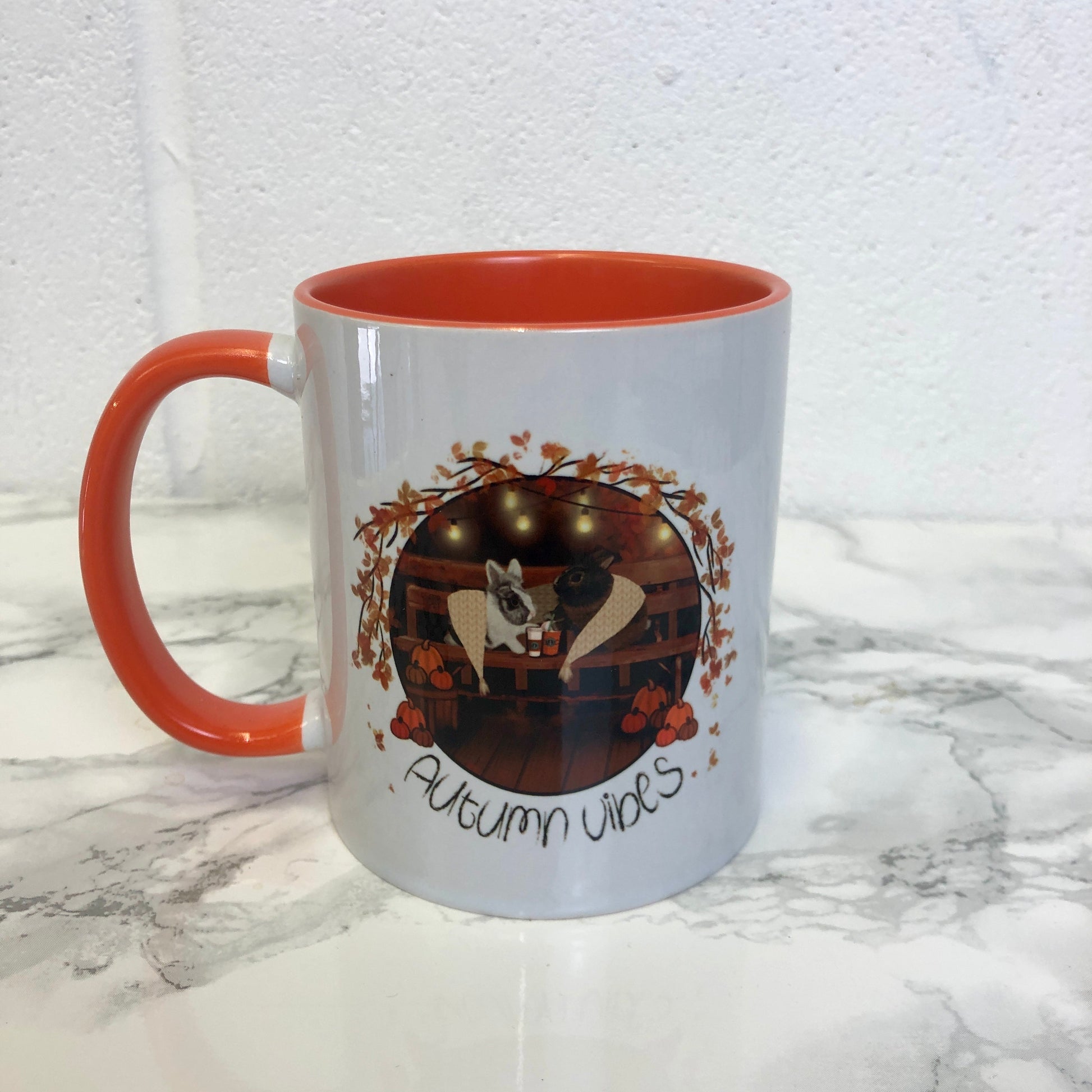 Cosy up and enjoy the Autumn Vibes with this adorable mug featuring The Warren Creation's bunnies Luna and Benjamin.