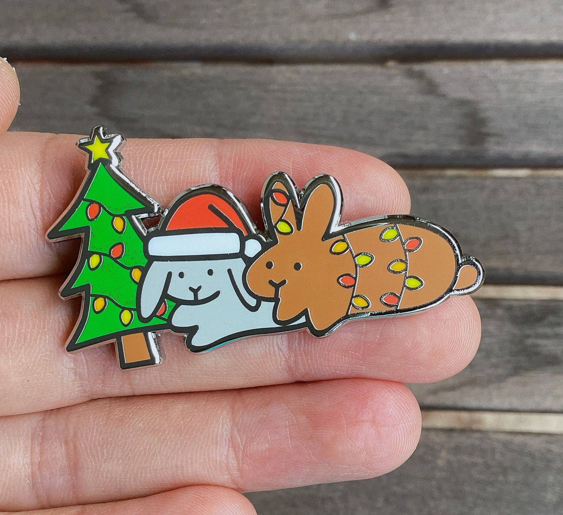 Materials: Hard enamel, silver-plated brass • Green tree with a light gray lop rabbit with Santa hat and brown bunny with holiday lights.