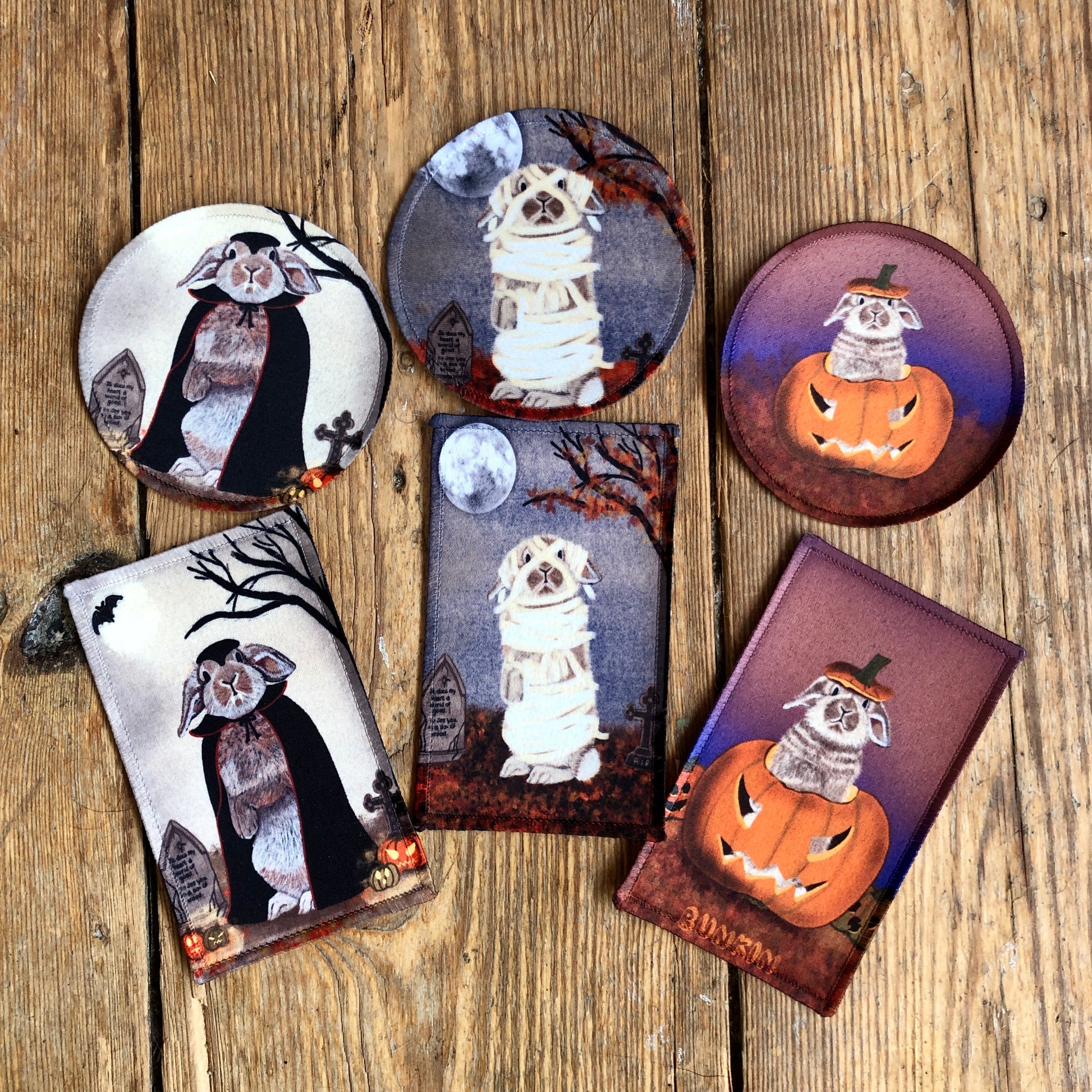 Spookily cute bunny iron on patches. Why not go as a crazy rabbit person this Halloween?