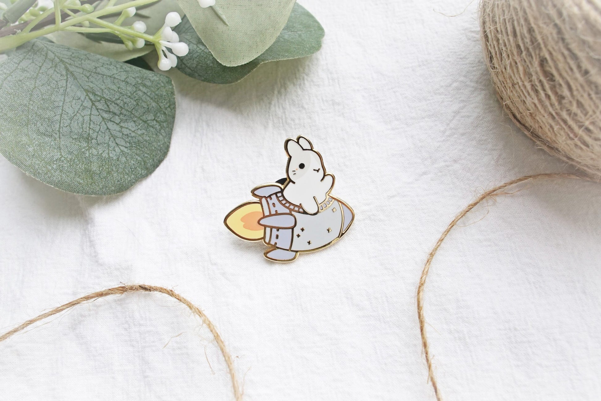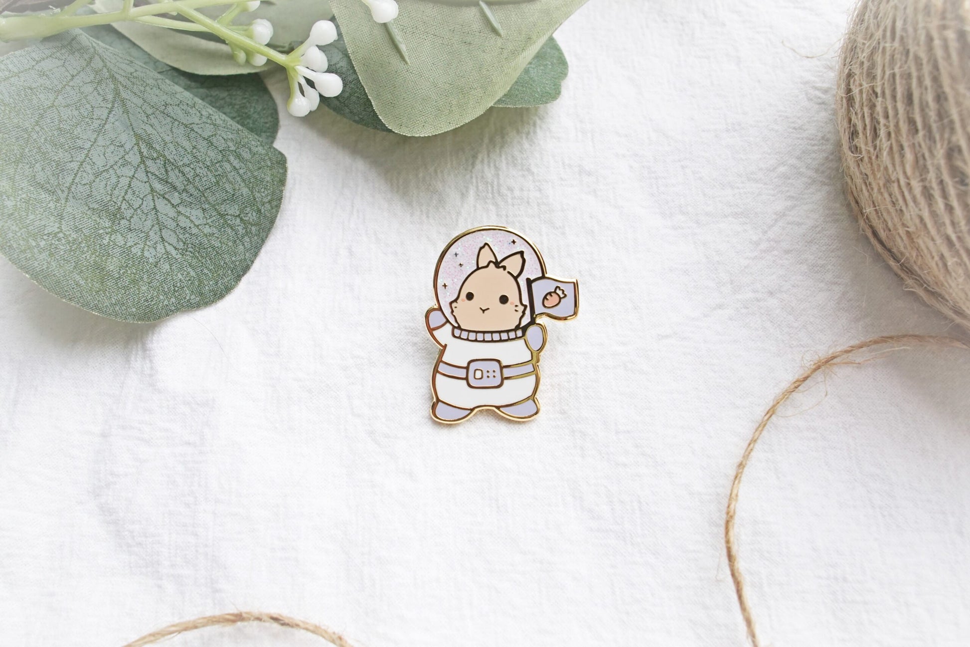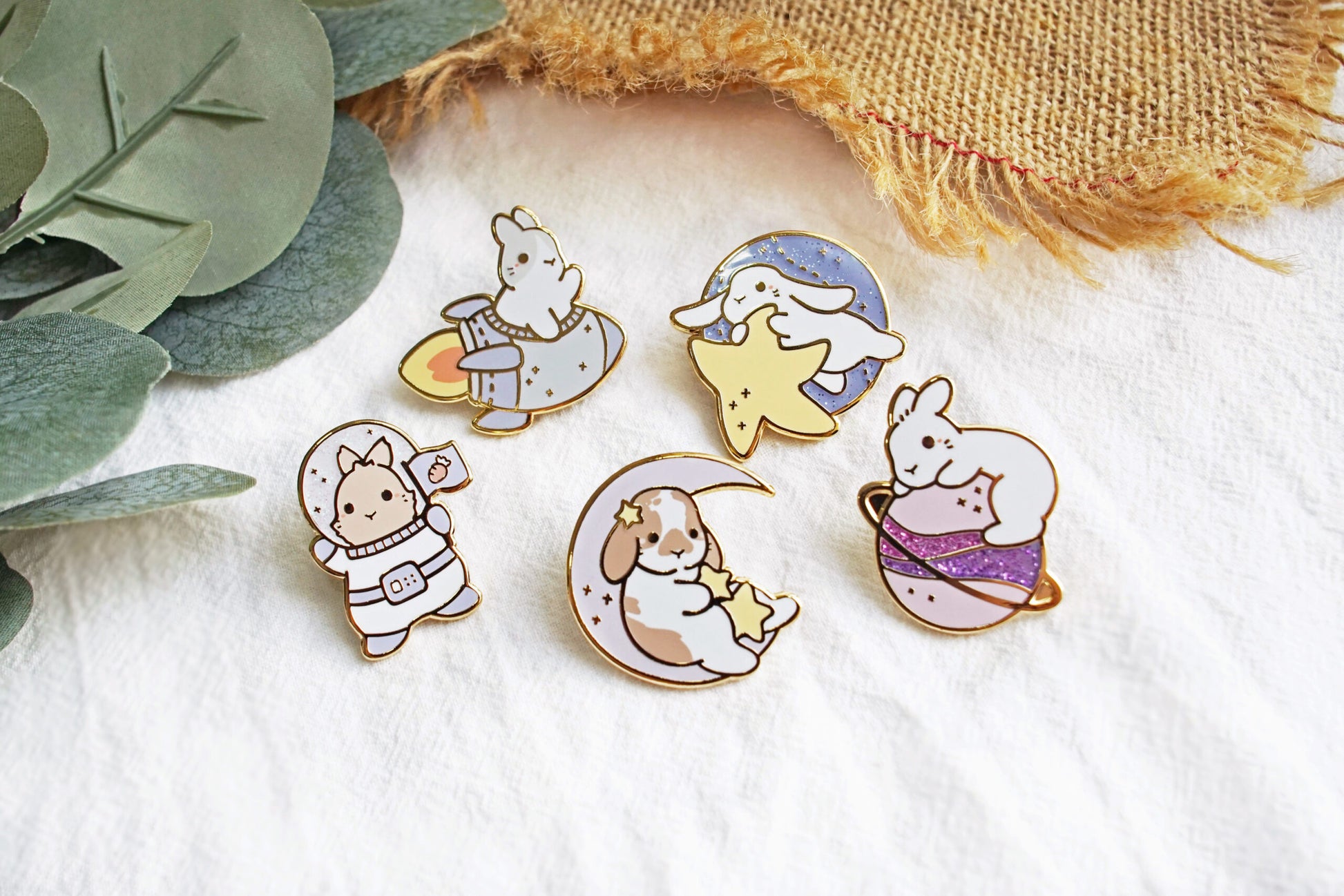 Enamel, gold-plated pins, with a glittery finish for a galactic feel, of Moon Bun, Planet Bun, Rocket Bun, Astro Bun, and Star Bun.