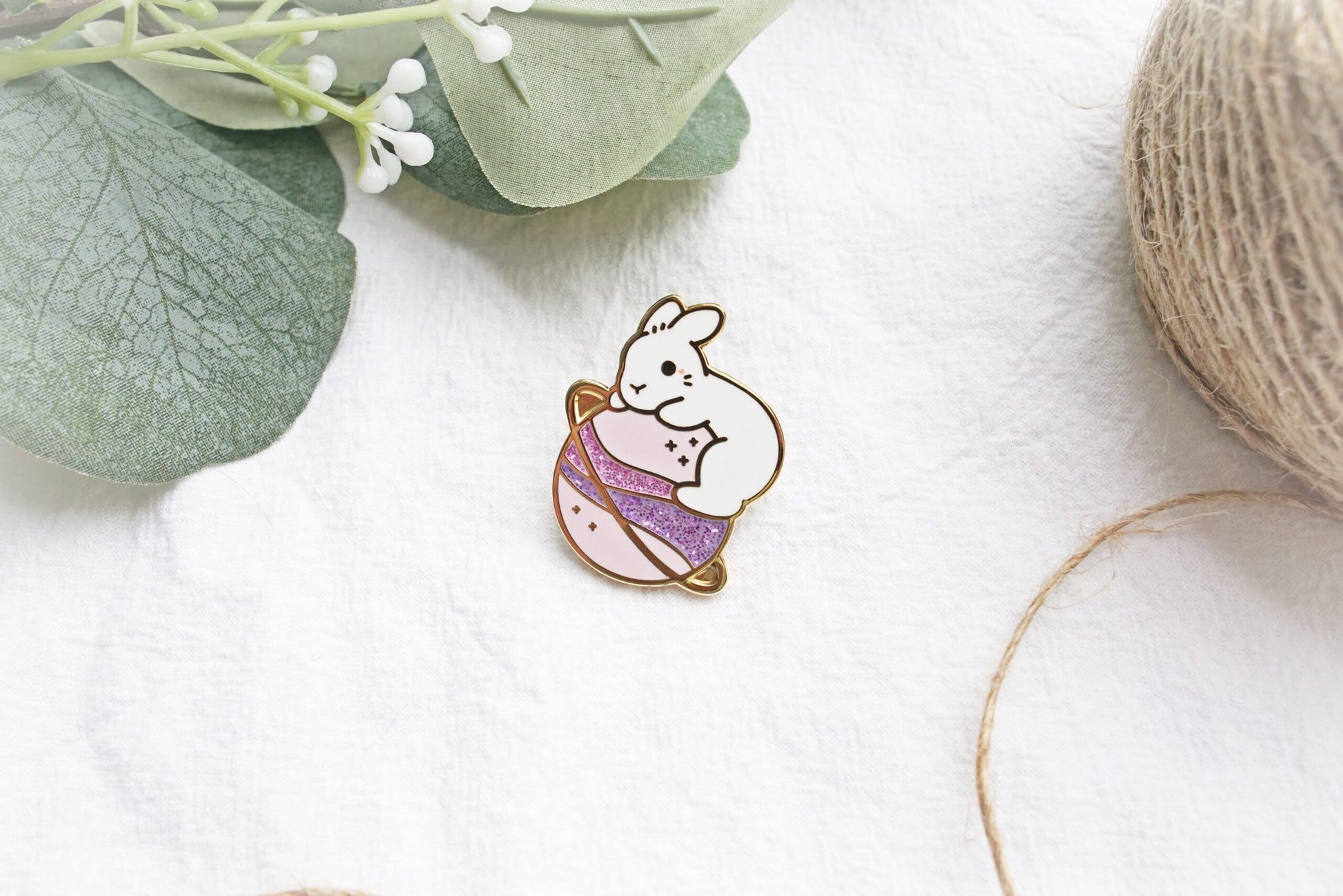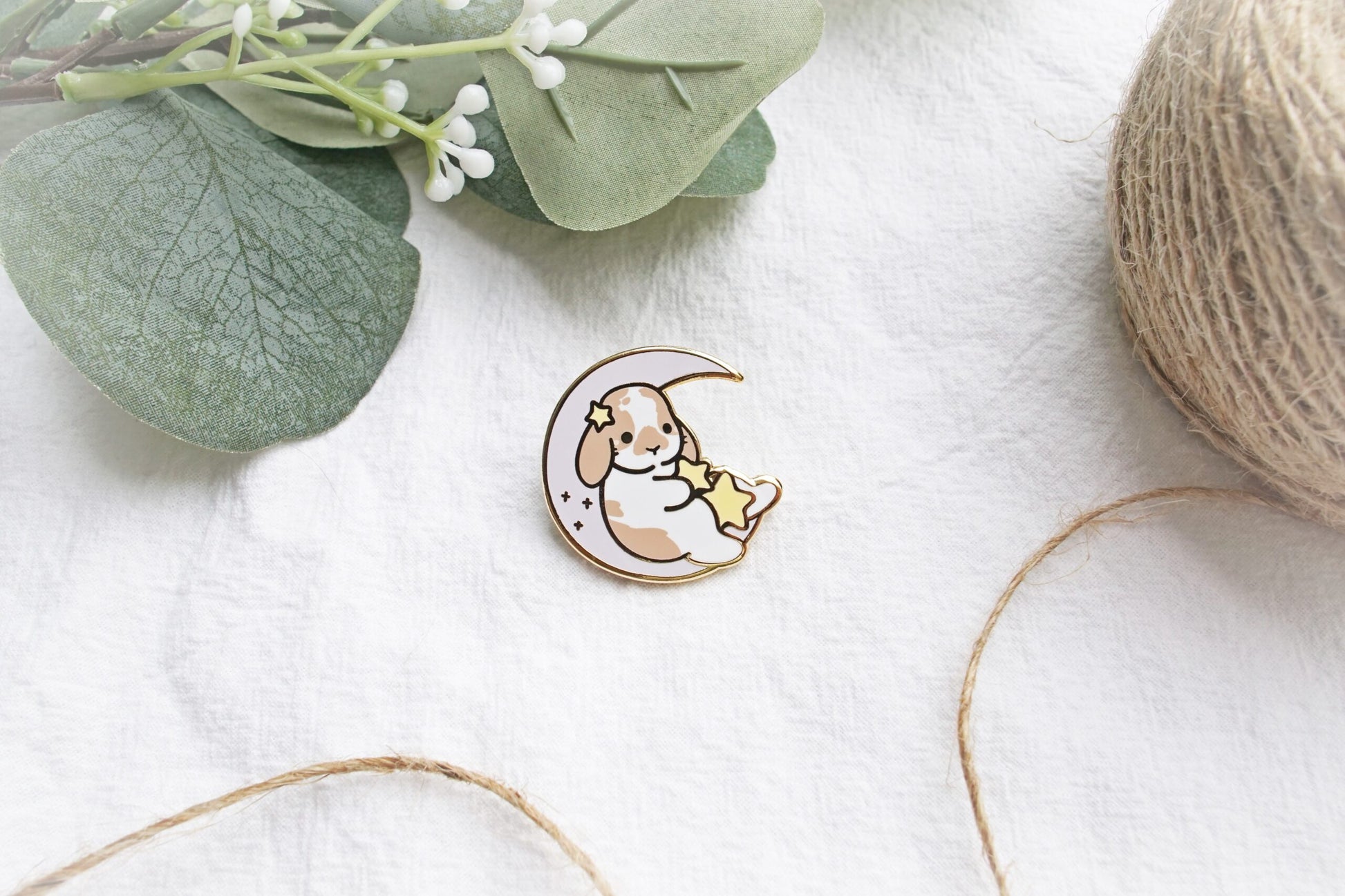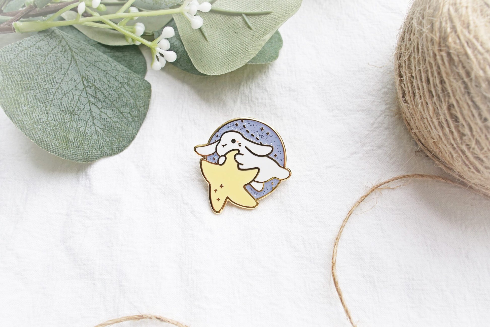 Enamel, gold-plated pins, with a glittery finish for a galactic feel, of Moon Bun, Planet Bun, Rocket Bun, Astro Bun, and Star Bun.