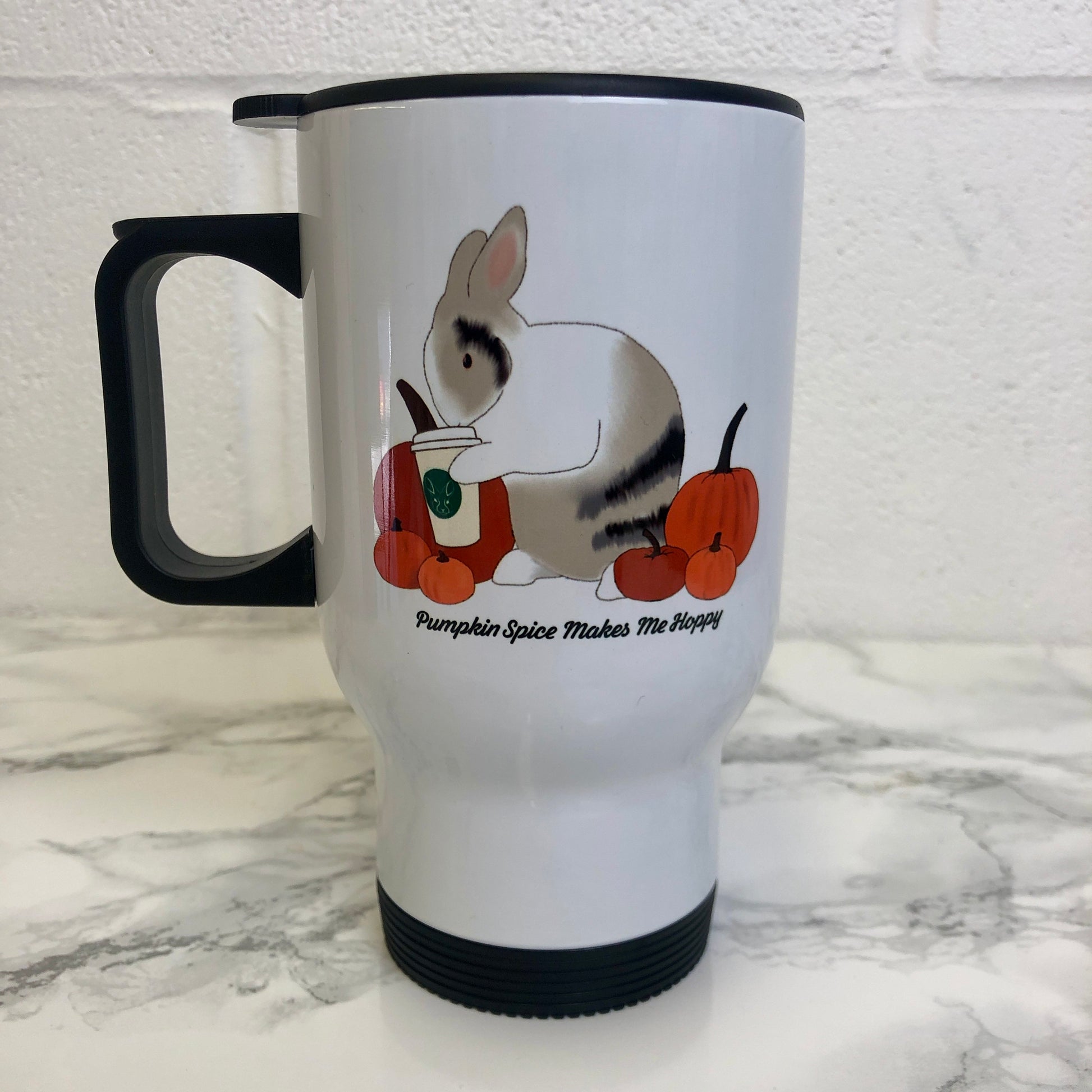 For basic buns who love their Pumpkin Spice on the go! This adorable travel mug features rescue bunny Waffle with his favourite Pumpkin Spice.